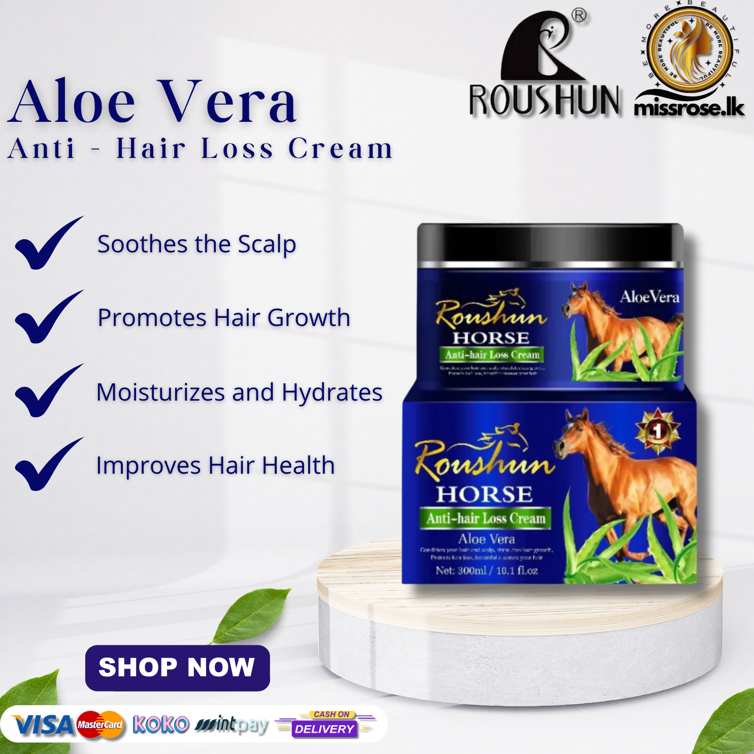 Roushun Horse Anti-Hair Loss Treatment with Aloe Vera is a product formulated to help reduce hair loss and promote hair growth while also soothing and hydrating the scalp. Aloe vera is widely known for its cooling, calming, and moisturizing properties, which can help improve scalp health and hair condition.
