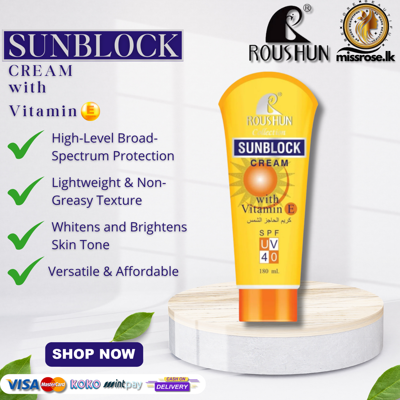 Roushun Sunblock Cream SPF 40 (180ml) offers comprehensive sun protection and skincare benefits, making it a versatile addition to your daily routine.