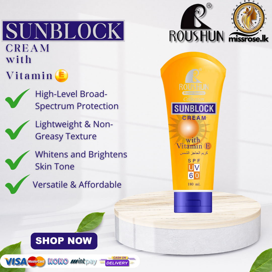 Step out with confidence and let your skin bask in the warmth — not the damage — of the sun. Roushun Sunblock Cream SPF 60 delivers high-performance, broad-spectrum protection against harmful UVA & UVB rays, helping to prevent sunburn, premature aging, and dark spots.