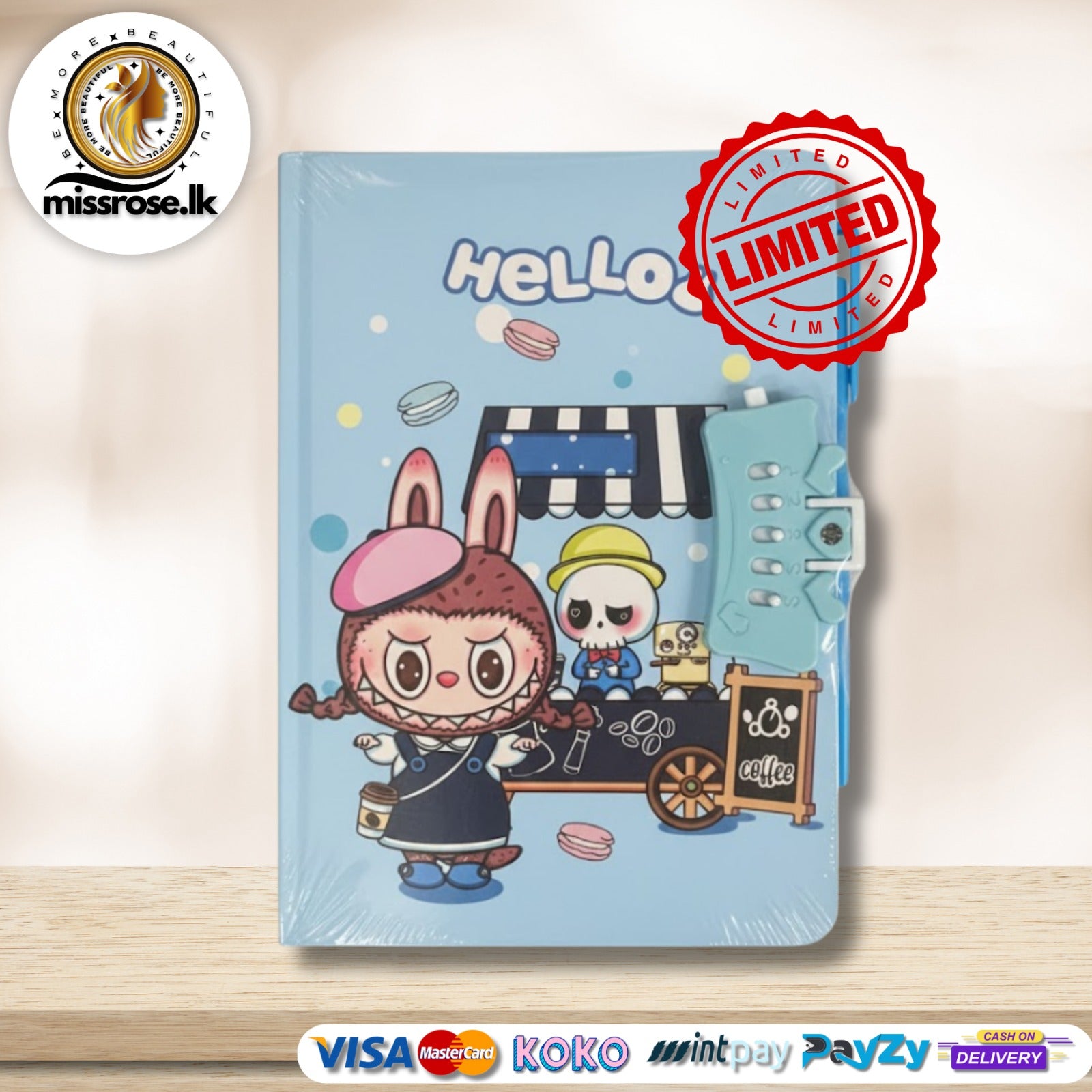 The Labubu Lock Diary comes in a charming blue theme featuring cute Labubu characters in a fun café-style illustration. Its playful design makes it a perfect choice for kids, teens, and Labubu fans who love stylish stationery.