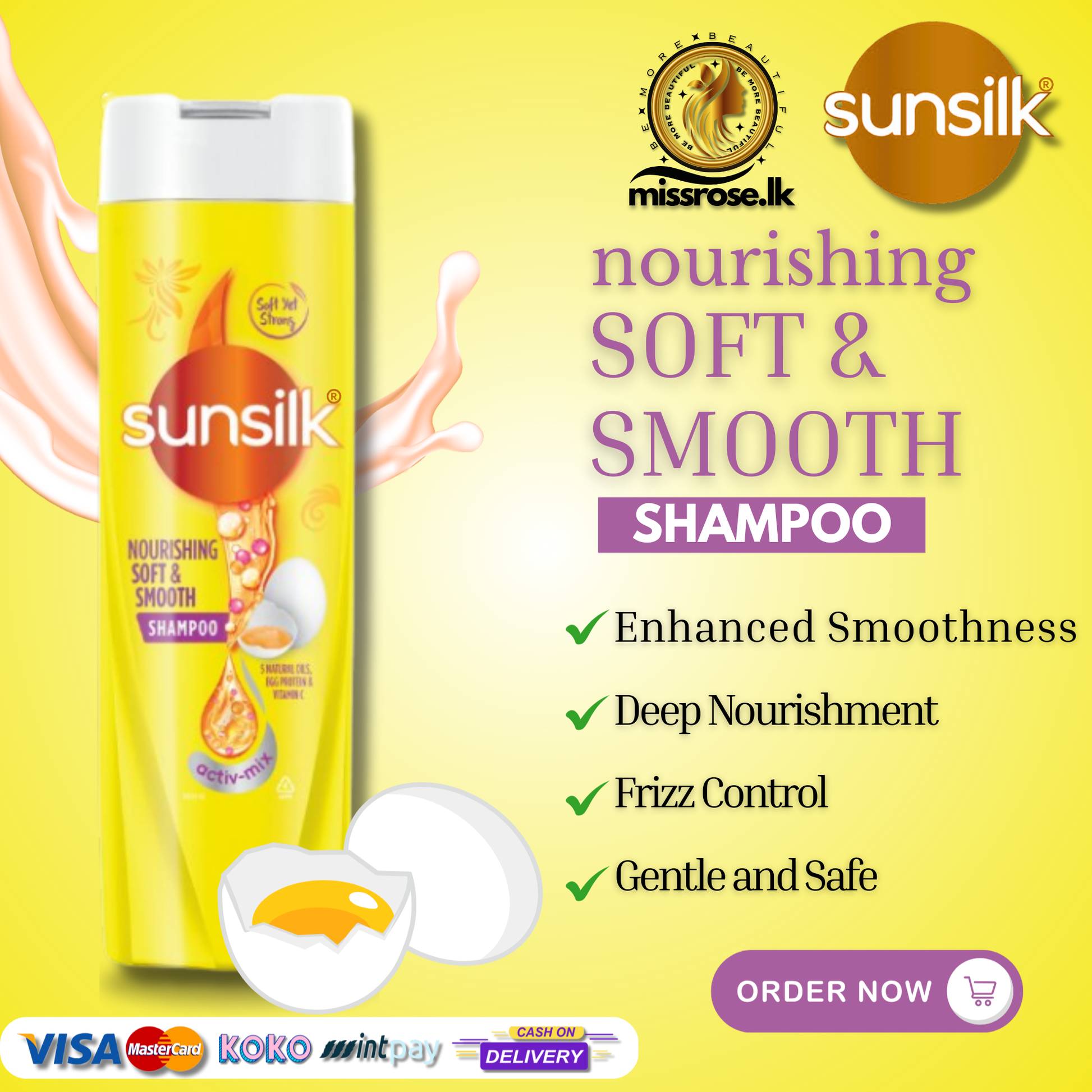 - For optimal results, follow up with Sunsilk Nourishing Soft & Smooth Conditioner.